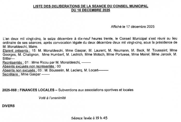 Liste des élibérations du conseil municipal du jeudi 16 décembre 2025