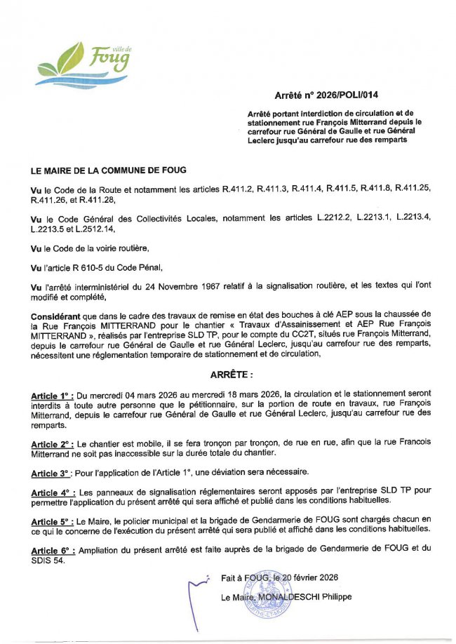Suite aux incidences des conditions climatiques, nous vous informer que l'intervention de reprise des étanchéités du réseau EU de la Rue F. MITTERRAND que nous devions réaliser à partir du 16 Février 2026 pour 1 à 2 semaines sera décalé au 04 mars jusqu'au 18 Mars 2026.