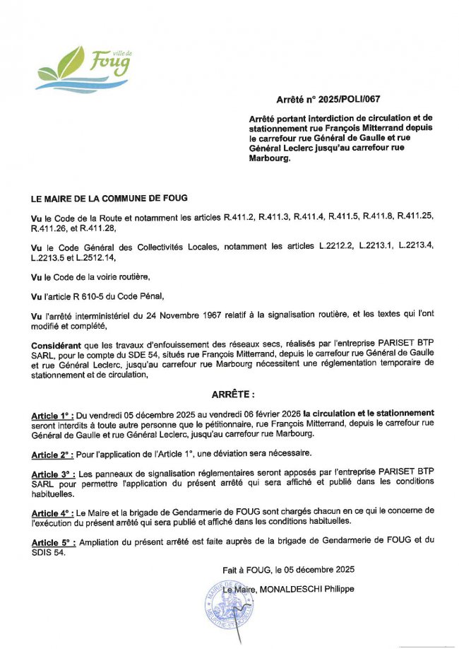 Arrêté interdisant le stationnement et la circulation sur carrefour Leclerc De Gaulle à FOUG jusqu’au 2 septembre 2025
