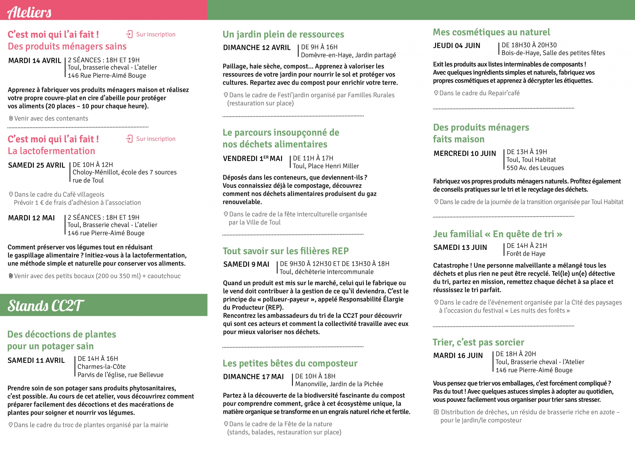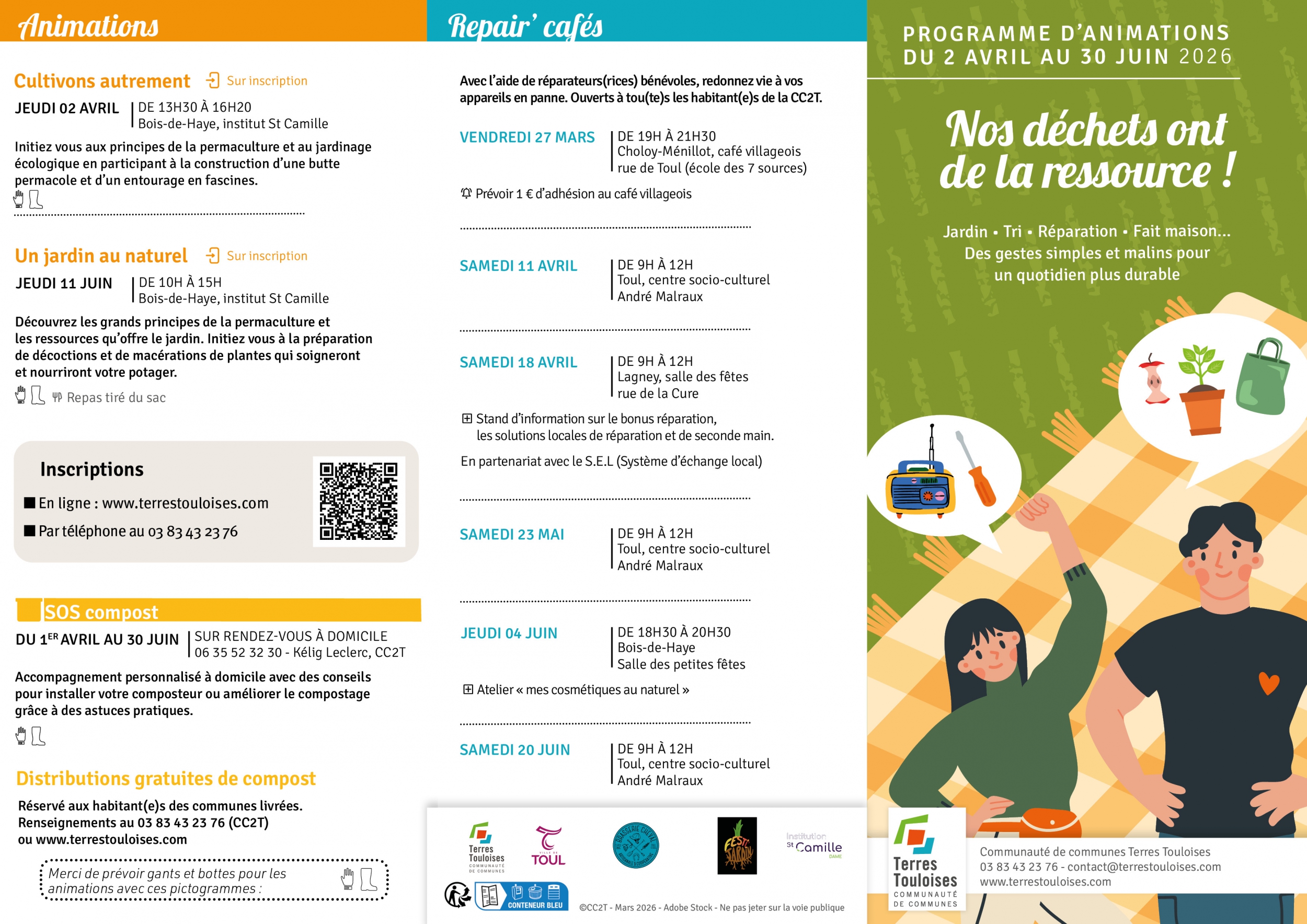 Du 2 avril au 30 juin 2026, la communauté de communes Terres Touloises (CC2T) lance son grand programme d'animations dédié à un mode de vie plus durable. Avec plus de 20 ateliers pratiques proposés sur le territoire, c'est l'occasion idéale pour passer à l'action et repartir avec des idées concrètes à appliquer chez soi.