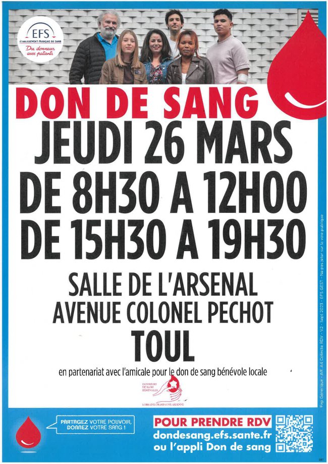 Une collecte don du sang est organisée à TOUL jeudi 26 mars de 8h30 à 12h et de 15h30 à 19h30. Nous vous remercions pour votre participation si précieuse.
