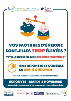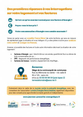 À l'occasion de la 5ème édition de la journée nationale contre la précarité énergétique organisée le mardi 18 novembre 2025, la communauté de communes Terres Touloises (CC2T) en partenariat avec l'Espace Conseil France Rénov, invite chaque habitant du territoire à rencontrer des conseillers afin de répondre à ses interrogations sur son logement et ses factures :