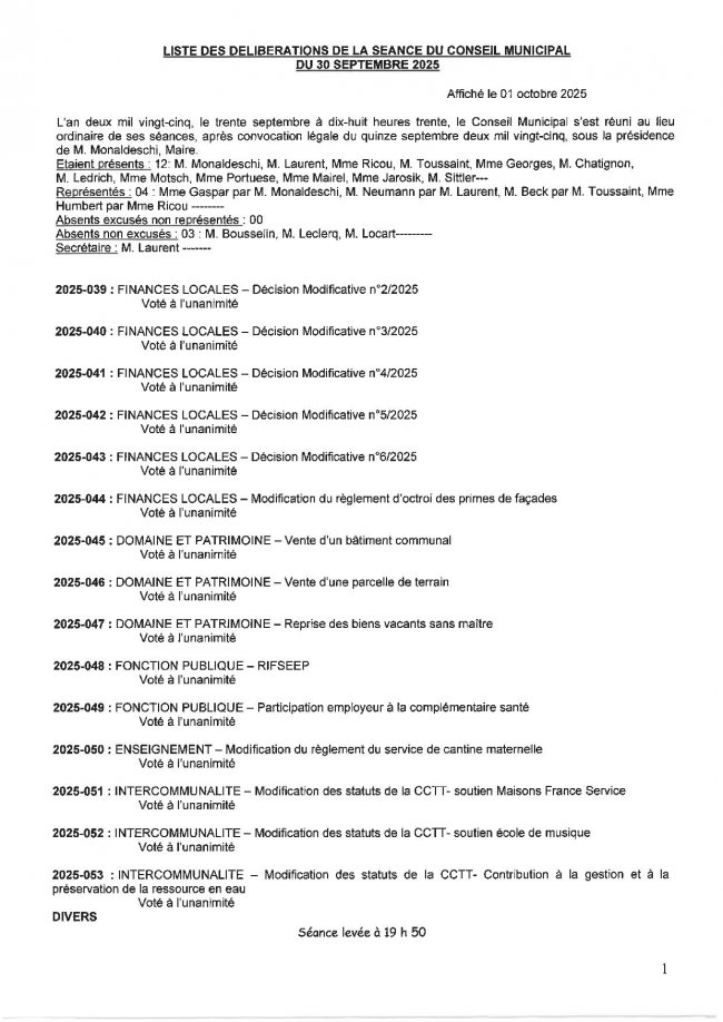 Liste des élibérations du conseil municipal du mardi 30 septembre 2025