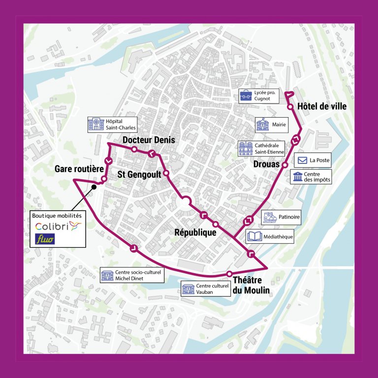 - Le parcours : La navette effectue une boucle d'environ 20 minutes au départ du Théâtre du Moulin. Elle dessert les arrêts suivants : Drouas, Hôtel de ville, République, Saint-Gengoult, Docteur Denis, et la Gare routière, avant de revenir à son point de départ.