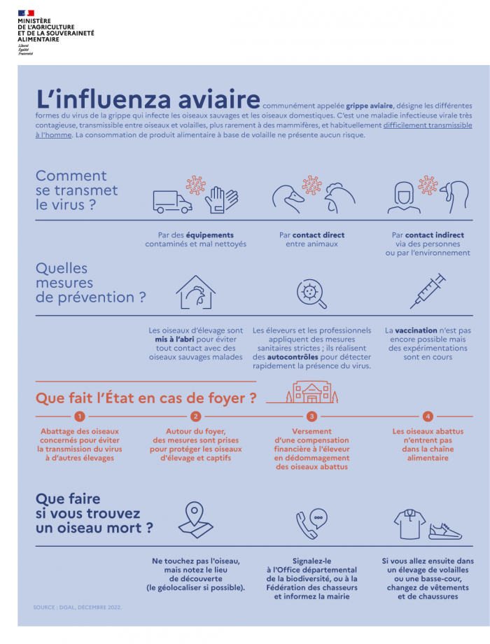 Depuis le 22 octobre, tout le territoire national est considéré à risque élevé vis à vis de l'IAHP. Les volailles et oiseaux captifs ont notamment du être mis à l'abri dans un environnement fermé ou protégé par des filets dans toutes les catégories d'élevage (professionnels, familiaux, d'ornement et de loisirs). Le détail des mesures de biosécurité à respecter peut être consulté à l'adresse suivante : Influenza aviaire : les mesures de biosécurité pour les opérateurs professionnels et les particuliers | Ministère de l'Agriculture, de l'Agro-alimentaire et de la Souveraineté alimentaire.
